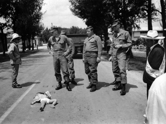 ここに一枚の写真(上の写真)があります。1965年4月20日、小さな女の子が米軍のトラックに轢き殺されたときに撮影された写真です。アメリカ占領下の沖縄で起こった事件でした。